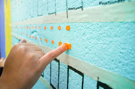 Finger tapping orange droplets. Isolated on white table. Blurred spotlights.