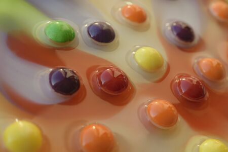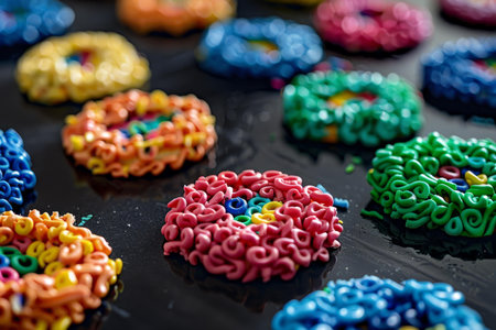 Closeup of vibrant, multicolored cereal in the shape of donuts on a dark background