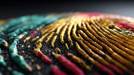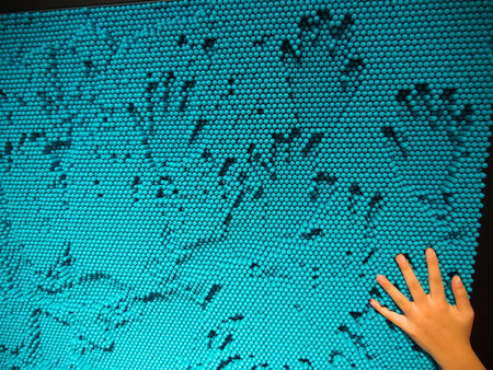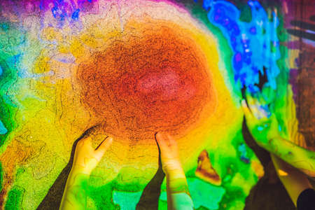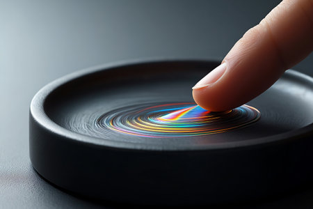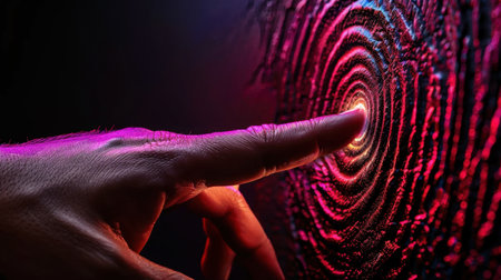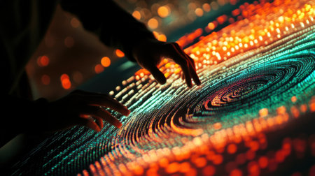 Hand gently touches textured surface, creating vibrant, swirling pattern of light and color. interaction evokes sense of curiosity and wonder, highlighting connection between touch and visual