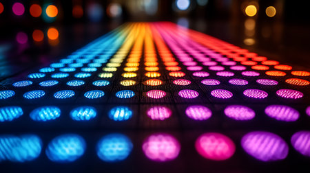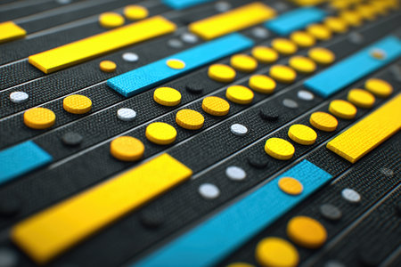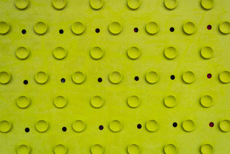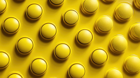 Bright yellow circular buttons arranged in grid pattern create vibrant and playful visual. smooth texture and uniformity evoke sense of fun and creativity, perfect for design projects