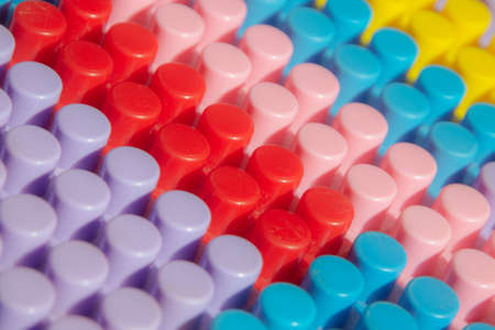 children's play background: the plane of plastic multi-colored bricks, blur, selective focus