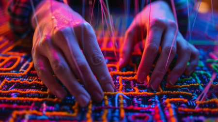 A close-up of hands manipulating multicolored threads, navigating a complex three-dimensional maze.