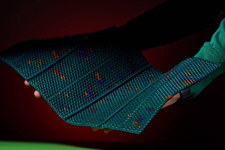 A green massage mat on a dark red background lies at the guy 's hands. Advertising, Thematic and subject shooting. For relaxation and health. Thematic and promotional photography