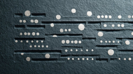 Dark gray surface with a repeating pattern of horizontal lines and circles. The lines and circles are embossed or carved into the surface, creating a three-dimensional effect. The circles vary in their arrangement and spacing within the lines.