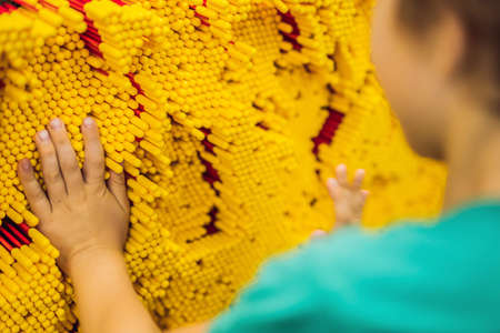 Boy hand plays with a panel with chopsticks. Simple task for development of fine motor skills in children.