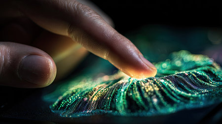 Concept of security and password control through fingerprints in an immersive technology future and cybernetic, business future.