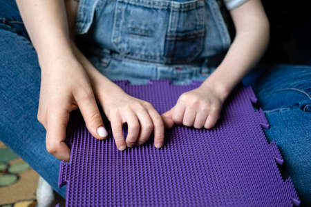 Sensory Play for Kids with Special Needs. Activities for kids with disabilities, Cerebral Palsy. Boy with Cerebral Palsy playing with Sensory Mat Massage Game Puzzle Mats for Kids