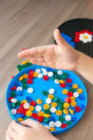 The child collects a flower figurine from a colored mosaic. Early education, development.
