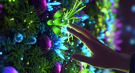 A person's hand gently reaches out to touch a vibrant, glowing collection of fantastical, bioluminescent plants. The surreal, otherworldly flora in shades of blue, purple, and green creates a magical and futuristic scene of discovery and interaction with alien nature.