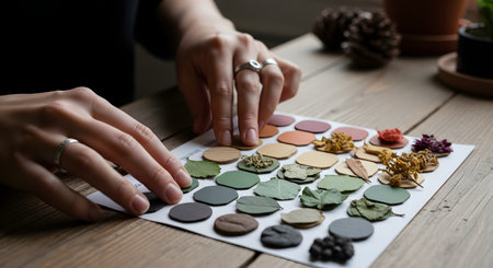A close-up of a designer's hands organizing a color palette made from natural materials like dried leaves and petals. The eco-friendly mood board demonstrates a connection between nature and design.