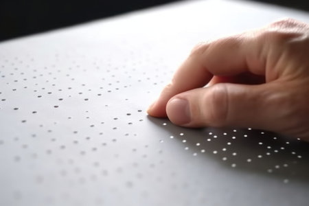 Close-up of hands in red sleeves gently touching a bright yellow tactile panel with raised black braille, set against a blurred, textured concrete background.