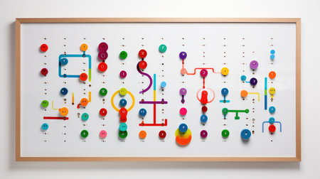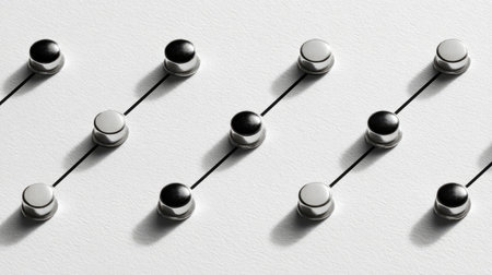 A striking abstract composition featuring black and white buttons connected by lines, casting interesting shadows on a textured background, ideal for modern design projects.