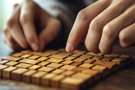 Close up of hands solving a sudoku puzzle with wooden pieces on a table, demonstrating focus and problem solving skills