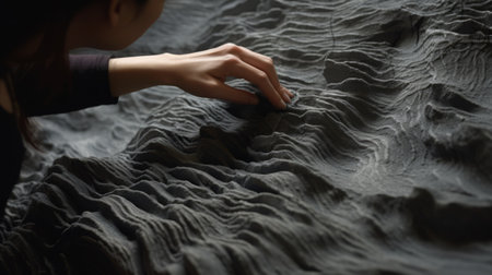a woman holding a tactile landscape piece showcasing accurate topography. the artwork features a dark gray and black color scheme, incorporating interactive exhibits. it is created using traditional japanese artistic techniques, with hard surface modeling and wavy resin sheets. ai generated