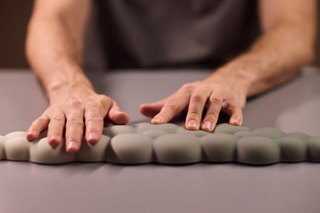 Ergonomic cushion setup, Closeup of hands interacting with ergonomic cushion, Designer testing ergonomic wrist cushion setup