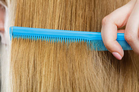 Combing and brushing concept. Routine everyday hygiene. Close up of detail blue comb in blonde smoothy healthy female hair.