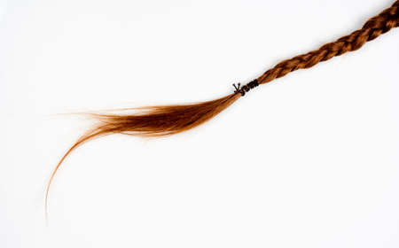 light brown pigtail on a gray background. Healthy natural hair. Hair care concept. Close up.