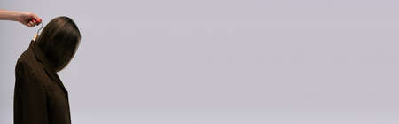 woman holding hanger with model in brown recyclable blazer isolated on grey, banner