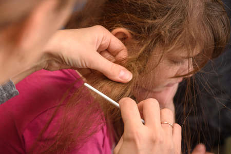 Closeup of a hairstylist doing hair on a white background. model client with blue hair