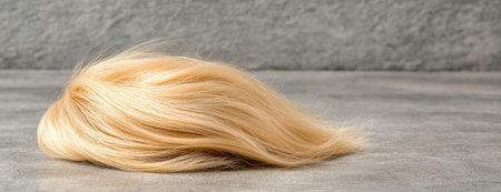 Hand holding long blond hair donation tightened with ribbon ponio for cancer patient on white background. Natural material for making wig. Horizontal, Copy space for textt and design.