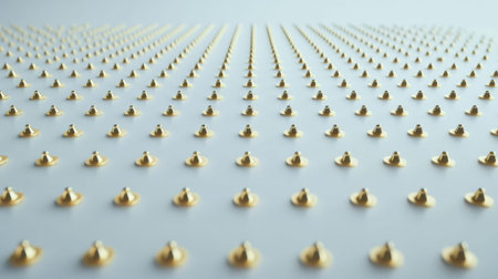 This image captures a striking close-up view of metallic rivets arranged in a meticulous symmetrical pattern on a white background, showcasing texture and detail.