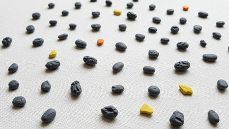 This image features a multitude of small, irregularly shaped objects, predominantly dark gray or black, scattered across a plain, light-colored background. A few vibrant yellow and orange objects are interspersed among the darker ones, creating visual accents. The objects are arranged in a somewhat random yet visually appealing pattern, with varying distances between them. The lighting is soft and even, highlighting the textures and forms of the individual pieces. The perspective is from a slightly elevated angle, looking down upon the arrangement.