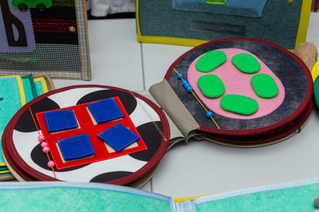 Handmade textile book for baby playing and development. Pages with funny geometric objects and flip balls. Baby development. Educational toys. Fine motor skills.