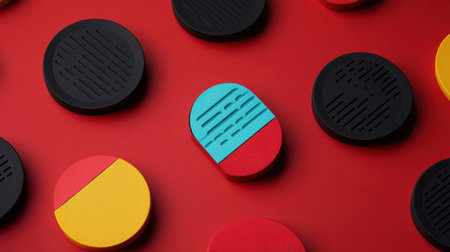 This image features an array of colorful geometric shapes set against a vibrant red background. Ideal for art, design, or creative inspiration.