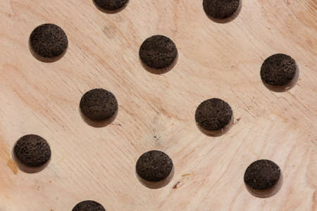 Wooden washer with holes for dishes shown close up. A colorful photo. Interesting background.