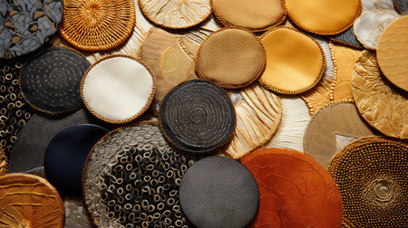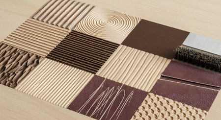A sample board displays a variety of materials with different textures, arranged in a grid. The swatches include carved wood with linear and circular patterns, different grits of sandpaper, and other tactile surfaces, perfect for concepts related to interior design and material science.