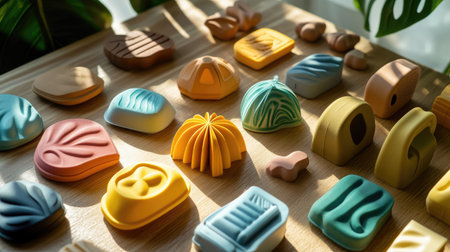 An assortment of colorful geometric shapes lies scattered on a flat surface. The collection features a variety of materials, textures, and vibrant hues creating an appealing visual display.