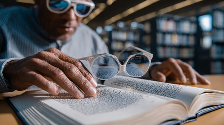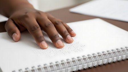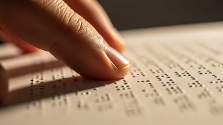 Close-up of hands reading a Braille book, with soft light highlighting the raised dots, symbolizing literacy and accessibility for the visually impaired.