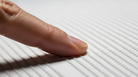 A human hand gently touches a textured braille surface, symbolizing access and inclusivity in education for visually impaired individuals. The tactile experience promotes awareness and understanding.