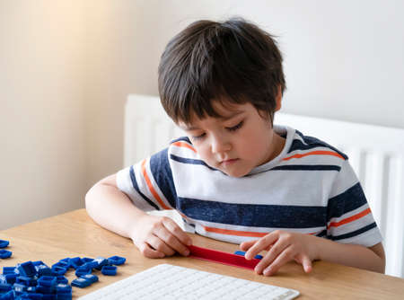 Preschool kid playing English words game,Child boy concentrated with spelling English letter with parent at home. Activity for children for play and learn, Education and Homeschooling concept