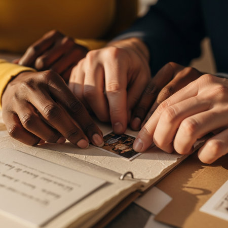Extreme close-up, macro editorial shot of a diverse couple's hands collaborating intently on a handm