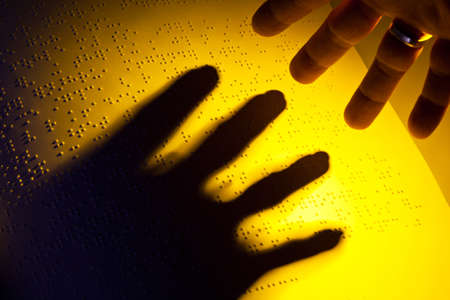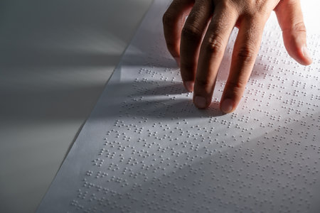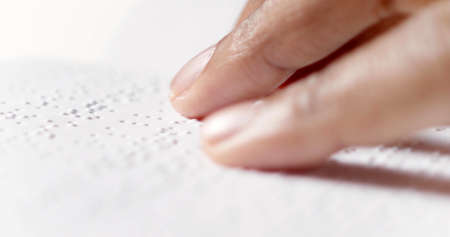 Hand of a blind person reading some braille text on page paper to learn. Finger of blind student touching the braille alphabet Code on sheet.