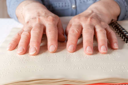 Braille book with visual impaired, low vision, blind person's hand/ finger touching paper texture reading the sign