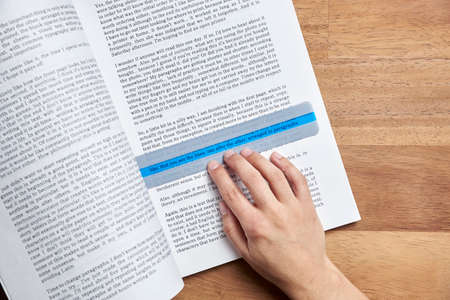 Unrecognizable young person studying with the help of a colored reading ruler, an educational tool that helps people with dyslexia read more easily.