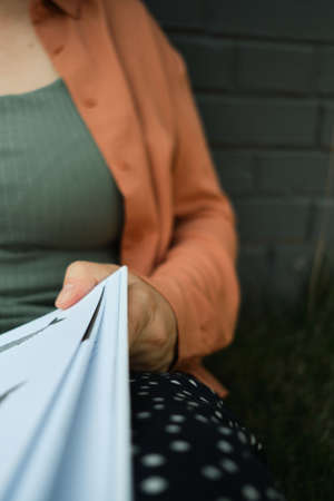 Young adult millennial reads book. Lifestyle and body positive. Green grass and brick wall. Close up, selective focus