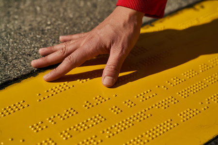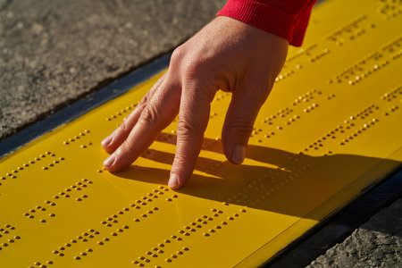 Close-up of two hands in red sleeves gently touching a bright yellow tactile panel with clear braille on a textured concrete background. Emphasizing tactile interaction.