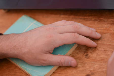 Closeup craftsman hands typing text for branding leather with personal stamp. Creating craft label