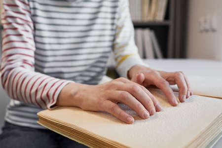Close up of unrecognizable person reading Braille book in college library, copy space