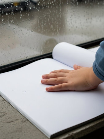 A young hand gently gestures toward vibrant picture pages, bathed in soft sunlight, capturing a peaceful, inviting atmosphere of childhood discovery.