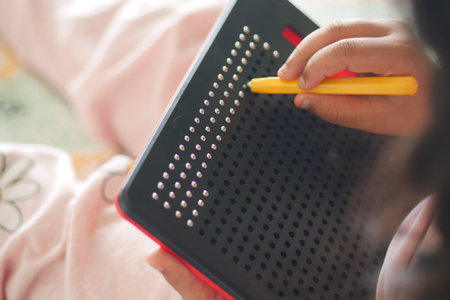 Child Engaging with Magnetic Dot Drawing Board for Creative Play