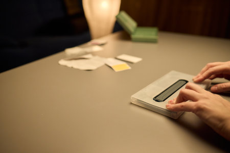 A person reading Braille on a notebook with their fingers on a wooden desk