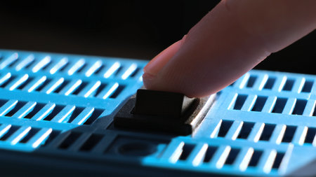Air conditioning technology, Finger pressing the cooling button, Close-up.