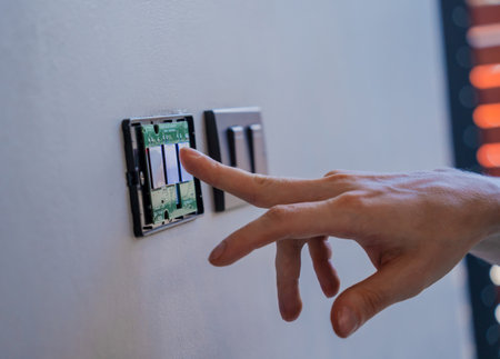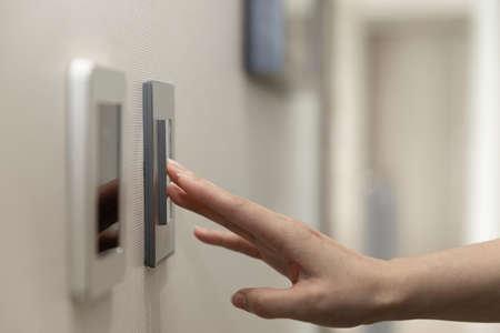 Light switch button on the blue cement wall. Energy use in home. Electricity consumption.