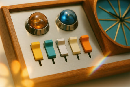 Multi-colored light switches on a pink wall. Fashionable colorful electrical switch. Creative style. art