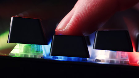 Human finger is clicking on the key on the computer keyboard, close up view. Finger presses on the gaming keyboard key with led light, macro shot. Low angle view with a soft focus.