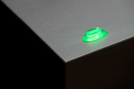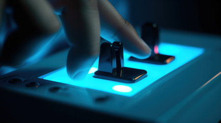 An intense close-up reveals a vibrant, textured red switch glowing softly against a sleek dark panel, creating a striking contrast with subtle lighting highlights.